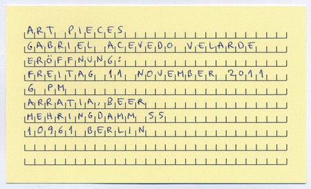 | Gabriel Acevedo Velarde Art Pieces / tonotono Opening: Friday, November 11, 2011 6–9pm November 11, 2011 - January 28, 2012 Opening hours: Tuesday - Saturday 12 - 6pm Gabriel Acevedo Velarde was born 1976, Lima, Peru and lives and works in Berlin. His work encompasses a variety of media and practices such as drawing, installation, video, music and performance. His work has recently been exhibited at the Biennale de Lyon (Lyon, 2011), Yerba Buena Center for the Arts (San Francisco, 2010), Museum of Fine Arts, Houston (2010), Sao Paulo Biennial (2010), Temporäre Kunsthalle (“Auto-Kino” a project by Phil Collins, Berlin, 2010). Gabriel Acevedo Velarde has had recent solo shows in international institutions including: Territorial, a sound installation at the Museo de Arte Moderna de Sao Paulo; Cone Flow, Modern Art Museum of Forth Worth, FW, Texas; Quorum Power, Museo Carrillo Gil, Mexico. Gabriel Acevedo Velarde wurde 1976 in Lima, Peru geboren und lebt und arbeitet in Berlin. Sein Werk umfasst eine Vielzahl von Medien und Praktiken wie Zeichnung, Installation, Video, Musik und Performance. Seine Arbeiten wurden kürzlich auf der Biennale de Lyon (Lyon, 2011), Yerba Buena Center for the Arts (San Francisco, 2010), Museum of Fine Arts, Houston (2010), Sao Paulo Biennale (2010), und Temporäre Kunsthalle ("Auto-Kino" ein Projekt von Phil Collins, Berlin, 2010) ausgestellt. Gabriel Acevedo Velarde hatte Einzelausstellungen in internationalen Institutionen, darunter: Territorial, eine Klanginstallation im Museo de Arte Moderna de Sao Paulo; Cone Flow, Modern Art Museum of Forth Worth, FW, Texas; Quorum Power, Museo Carrillo Gil, Mexiko. Arratia, Beer Mehringdamm 55 D-10961 Berlin Te: +49 30 23 63 08 05 Opening Times: Tue to Sat 11.00-18.00 | ||||