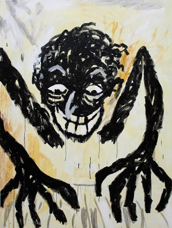 | Ricardo Gonzalez: "Rot Open in Bliss" December 11, 2014 - January 31, 2015 Opening Reception: Thursday, December 11, 6 - 8 pm Asya Geisberg Gallery is pleased to present "Rot Open in Bliss," an exhibition of paintings by Ricardo Gonzalez. This will be the artist's first solo exhibition at the gallery. Gonzalez employs a virtually monochromatic palette and simplified gestures to explore the language of abstract painting. Mutinous, tarry figures bearing grimaces and smirks intermittently disrupt the series' more unfettered compositions, which at times suggest both rudimentary aspects of a figure, and remnants of cultural iconography. "Smile" for example could be the profile of Caesar, while "Phone Minimal" recalls a laughing Ronald McDonald. While creamy grounds contrast lustrous black daubs, brazen error disrupts fugitive imagery, further exposing the idiosyncrasies of the artist's hand and our desire to form a figure. A symbiotic duality exists within the series, as the artist ricochets between the sublime and the nihilistic, creating a tacit dialogue between satirical cartoon and evocative painterly gesture. Skateboard graphics and the Neue Wilde painters of 1980's Germany are notable inspirations, whilst inky black figures with popping eyes and uninhabitable bodies - offspring of Sergio Aragone's MAD cartoons and Gonzalez's own schoolbook doodles - populate the artist's own Wilden Szene. The painting "Rot Open in Bliss," a title taken from Anthony Burgess' novella "A Clockwork Orange," depicts a deranged, bodiless figure with arachnid arms in the midst of creative rhapsody. Synonymous with Lacan's jouissance, Gonzalez's character transcends enjoyment, to straddle the boundary between ecstasy and violence. The essence of jouissance saturates Gonzalez's cartoonish figures; their implausible physiques with misshapen limbs suggest a crescendo of pleasure on the brink of savagery. Painted to the sounds of Beethoven, Gonzalez's frenzied pianist exemplifies the emotional tipping point. His smile, contorted with pleasure, tips over into a grimace. His eyes bulge whilst hands thrust at the keys, leaving us to only imagine the symphony, a sentiment Burgess himself depicted: "Oh, bliss, bliss and heaven. I lay all nagoy to the ceiling, my gulliver on my rookers on the pillow, glazzies closed, rot open in bliss, slooshying the sluice of lovely sounds." Error and chance continue to charge more minimal works, where the artist retreats back into the medium, creating grand imagery with restrained line. The artist utilizes the most minimal gesture to articulate a milieu in "Two Laughing;" a mixture of fluid line and solid black pools deftly conjures a conversing couple motioning toward something humorous outside the picture plane. The most direct reference to the doodled page comes via "Sleep," where a quirky head floats within an impatiently sketched dreamscape of limbs, a fragmented face, and an imperceptible scribble reminiscent of the iconic Arby's hat. Gonzalez elevates seemingly cursory doodles from their predictable banality, as subconscious "automatic" drawing amasses significance, transcending into objects of art, and becoming signifiers of pure form, medium, and process. Ricardo Gonzalez was born in Mexico City and lives and works in New York. He received an MFA from New York University, and his BFA at New England School of Art & Design, Boston, MA and Madrid, Spain. He has exhibited in numerous venues in New York, NY, Boston, MA, Miami, FL, Berlin, Mexico, and Belgium. Recent exhibitions include UNTITLED. Miami, Galeria Talcual, Mexico City, Traneudstillingen, Copengahen, Denmark, and Galeria W, Santiago, Chile. He is a recipient of the Martin Wong Scholarship Award in Painting. | ||||