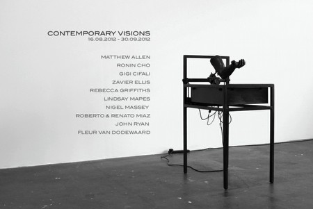 | Contemporary Visions 16th August 2012 - 30th September 2012 Contemporary Visions is the first group exhibition at the newly relocated Beers.Lambert Contemporary in its new premises near Old Street Station. The exhibition presents 10 contemporary international artists, (selected from an pool of nearly 1800 applicants worldwide,) who each question the destability of the image and of presence. The collective point of departure for each of the artists is precisely how a vision of reality becomes translated through the artistic frame of reference. The selected artists work in all media and within all genres of art - from figurative to abstract and even conceptual, each being selected for an artistic practice that somehow perceives reality as one that has been fragmented, reconstructed, and destabilized. Certainly the title Contemporary Visions refers (at least poetically) to that forward vision which might present some transcendent answers for our present existence - a type of artwork (figuratively speaking, of course) as self-fulfilling prophecy in and of itself. Perhaps more literally, it suggests a desire for tomorrow's art to achieve that vision which remains ceaselessly ahead of the curve, referring to the very acts and objectives of the artists themselves, as the very nature of 'contemporary art' suggests an art that looks toward the future, identifying and successfully embodying that which is yet to come - that which today remains indefinable. Therefore the exhibition takes as its origin the notion that perception and perspective is subjective, and dependent on experience and a fictional recreation of that perceived experience. The unifying conceptual thread that runs throughout the exhibition appears to call forward to some anxiety toward an Orwellian future - yet one that very consciously presents itself as more Logan's Run than Blade Runner. One might prematurely reflect upon this collection of work by stating the exhibition is conceived as a vision of 'tomorrow', however in order to avoid the oversimplified connotations therein, the exhibition remains about how one sees and how one frames the object for receipt of the viewer. Fleur van Dodewaard's 'frames of frames within frames' operate very consciously like photographic Russian-dolls: like a second-party recounting a tragic accident which somehow loses gravitas with each retelling, there remains a phantom of some not-so-distant origin that exists lurking beneath van Dodewaard's careful photographic mise-en-scene. Still, there remains a lighthearted play between the intention of these artists and the execution, presentation, and interplay of the works. Indeed the works appear to emanate a view of a dystopian society, but this is a view masquerading in utopian hues. Matthew Allen's subversively cheerful tone-on-tone paintings come to mind, like candy-colored epitaphs in bubble-gum pinks and sky blues, suggesting a depth of meaning lurking beneath the surface of the canvas that reveals its true melancholy with prolonged viewing. John Ryan’s exploration of perception delves into the purely material, in which paint becomes topographic, sculptural, and utterly anthropomorphic. Swaths of metallic oil paint are playful in Lindsay Mapes' DIY-style paintings, arriving in garish neons, gold, and silvers, laden atop the canvas in purposeful heaps like lunar astro-turf; but the vision here is also gloriously (and metallically) carnal, with Rebecca Griffith's Twin Turbo apropos for a contemporary fossil of urbanity seemingly lifted from Crash, JG Ballard's pessimistic take on consumerism and sexuality. For Griffiths, it appears that inner turmoil and consumerist spectacle have collided in some monstrous, albeit slickly sensuous amalgam of forms. Nigel Massey's neat, plexi-glass encased displays stand like solitary tomes self-consciously recalling the West's search for mysticism through a (mis)appropriation of Asian-culture, perhaps through its ubiquity in contemporary decor alongside what might appear to be specimens encased from 'the homeless', (with media including ink-soiled blankets, chipboard, and brooms), the entire package seems practically ripe for the gaze of the museum visitor from the future to consider, however accurate or not, scenarios of privileged 21st century living. Perhaps Gigi Cifali best offers a tranquil restaging of our world - reframed in cameo form, these photographs from the Vesuvian landscape take on a strikingly contemporary newness. Their presentation as landscapes that have been cut into ‘portholes’ serves to accentuate the instability of the image and the artist’s unreliability in presenting the imagery for the viewer. Contemporary perceptions of our world - endlessly de-contextualized and re-contextualized - become awash in a Baudrillardian stream of thought, an endless array of images that, through reproduction, begin to lose any particular individuality. Zavier Ellis’ mixed-media works are presented like monumental palimpsests of a dystopian urbanity, like relics from some imagined past or not-so-distant future, a contemporary fragment of urban art and existence. It might be Roberto and Renato Miaz's exceptionally skillful paintings that could - in one respect - seem to paraphrase this ideology, where still-frames and fragments of memory, faces, and specifics become blurred - not quite out of reach but never fully attained. At long last it is the disconnect between reality and fantasy where the works find their strongest thematic strain; here the vision of a future reality is cyclical, and haunting: Ronin Cho's kinetic sculpture, Fair Idle, features the detached arm of a mannequin that cyclically and endlessly scoops handfuls of sand, only to pause as the sand slips through the cyborg's fingers, before returning to the pool of sand again and again. It is a futile act, repeated out of preconditioning and the inability to defy its apparent purpose. What Cho seems to critique with this piece is mirror