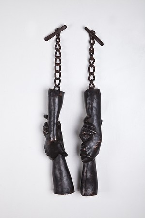 | SARA RAHBAR | SWARMING Sunday 2nd of November from 19:00 We are the self-fulfilling prophecy of the snake that eats its own tail, like the Ouroboros, of Greek mythology. Constantly all moving, like a horde of wasps, to one point all at once; protesting, screaming, fighting, hurrying to what end? Modern day slavery exists in the toil of work to make the materials that eventually contribute to our demise, we are lost in the collective hive of a machine that both sustains and destroys us. Carbon 12 is proud to present Sara Rahbar’s third solo show in Dubai, Swarming. Memory and ideological symbols are remixed with a very direct, physical syntax, while deconstructing personal history and the 21st century human condition. The materials collected or found and body parts casted reverberate against the walls in protest. Careful titles lead us in poetic discourse with the objects in front of us, and loose us along the way. There is a direct dialogue between the work and us, reflecting on aspiration and tragedy, we are witness to the battlefields of mankind and human nature itself. With geometric precision but organic arrangement, Rahbar combines wheels, batons, shoe forms, weapons, sickles, shovels, limbs, and other tools of once used trades, to create the workers eulogy. The sculptures act as sites of collection and remembrance. Once used and held by a human, the workers tools do not lose their humanity as the people who once used them lost their life, but stand as a representation for their sacrifice. Bronze cast arms, legs, and heads contort, confessing doubt filled apprehensions. With their sometimes bound, awkward or painful gestures, the limbs ask questions we are often fearful to know the answer to or anxiously nudge the relucent elephant in the room. Like the man made tools of years past, minds, bodies, and selves, labor away until grooves are worn away, points are no longer sharp and pieces move no more. The endless competition for success and standards of living drives humanity's lust for life to an early grave. We are left with a demonstration of how life extends beyond its own subjective limits and challenges the binaries we continually reconstruct between Self and Other, between our individual desires and collective movement towards “progress”. Born in Tehran, Sara Rahbar is a contemporary mixed media artist living and working in New York. Rahbar pursued an interdisciplinary study program in New York and also studied at London’s Central Saint Martins College of Art and design. Rahbar is internationally shown and collected worldwide. | ||||