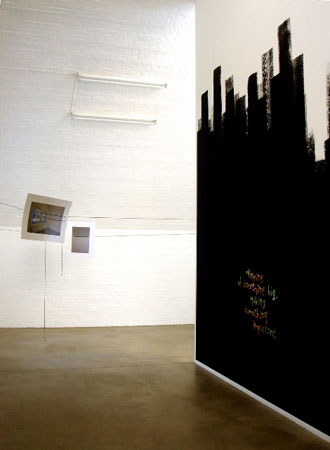 | * Full image description 1. Wall painting: Jan Christensen Thinking of Something Big, Making Something Important (#5) 2009 Wall painting, acrylic paint Dimensions variable GAG#JC 077 Courtesy: c/o - Gerhardsen Gerner, Berlin. 2 installative photographs: Jan Christensen They look at the photo for a second and glance around the room. They make a couple of steps to change their position and look at the photo again. They look at the line in the image and follow the line through the actual space before they look back at the photo. Then they step back and look around the the room properly. Some people might repeat this a couple of times. Then they turn around and move on. (#1) 2009 String and photo print Dimensions variable (sheet 47,5 x 69 cm; string: 6,17 m) GAG#JC 079 Courtesy: c/o - Gerhardsen Gerner, Berlin. Jan Christensen They look at the photo for a second and glance around the room. They make a couple of steps to change their position and look at the photo again. They look at the line in the image and follow the line through the actual space before they look back at the photo. Then they step back and look around the the room properly. Some people might repeat this a couple of times. Then they turn around and move on. (#2) 2009 String and photo print Dimensions variable (sheet 60,5 x 81,5 cm; string: 6,28 m) GAG#JC 080 Courtesy: c/o - Gerhardsen Gerner, Berlin. 2. Jan Christensen and Kristian Skylstad Watch Me Fly 2009 Wall painting (glossy transparent lacquer), empty record cover and inner sleeve Dimensions variable GAG#JC 082 Courtesy: c/o - Gerhardsen Gerner, Berlin. 3. Jan Christensen Nothing is For Free, Mother Fucker$, 2009 Acrylic paint on canvas (152 x 122 cm.), string, amplifier, speaker, microphone, sound distorter, gong, chime, two Tibetan singing bowls Variable dimensions Courtesy: c/o - Gerhardsen Gerner, Berlin. Jan Christensen Light Composition (#16), 2009 Selected glass lamps (Putzler), wooden platform, wire, power supply and electric cables Variable dimensions (approx. 192 x 70 x 70 cm) Courtesy: c/o - Gerhardsen Gerner, Berlin. Jan Christensen Funky Mental Rabbit Hole Opening reception: June 30, 2009 8�10 pm Exhibition duration: June 30�July 31, 2009 �The rabbit-hole went straight on like a tunnel for some way, and then dipped suddenly down, so suddenly that Alice had not a moment to think about stopping herself before she found herself falling down a very deep well. Either the well was very deep, or she fell very slowly, for she had plenty of time as she went down to look about her and to wonder what was going to happen next. (Lewis Carroll, Alice in Wonderland)� Lewis Carroll�s rabbit hole with its endless expanse has always been a fictional structure. Its author, a tutor in mathematics, probably did not expect that his children�s book would one day inspire lay poets to create works about the current economic situation. Above all, Carroll�s text opens the door to a confused, surreal world where the rules of conventional reason have started to waver, and more than ever what is called for are new ideas and unusual solutions. Jan Christensen has always been an engaged observer of creative practices, picking up on ideas and recycling artistic output, as his oeuvre is an on-going experimental project on what constitutes art. His work ranges from large installations and wall paintings, to works on canvas, sound installations, photography, video, light objects, and sculptures. The artist carefully traces the trends of our time, whether in art, general culture, the economy, or society. Such interests translate into exuberant works of appropriated material, found objects for installations, or graphics and photography for illustrations, designs and painterly compositions. In this way, Christensen creates works that reflect their different contexts. Some pieces are produced specifically for certain spatial situations. They refer to discourses in art as well as to the larger field of creative practices, popular culture and the engagement of the viewer. The occasional use of text, from rhetorical puzzles to modest personal statements, show the use of humour as a means to draw attention to the context of art and the ways we perceive it. Jan Christensen�s current exhibition at c/o � Gerhardsen Gerner presents several new works, including wall paintings, photography, installation and an interactive sound installation. Entitled �What could possibly be missing from an artwork with complex references, conceptual considerations and universal poetic impact? (#1)� is a condensed dust ball or so-called dust bunny. It is an attempt to discuss the factors that constitute a work of art, and the fact that rhetoric and references are integral components of the artwork by testing the paradox of conceptual validity with a minimum of execution. The emphasis on the �idea� is also reflected in �Thinking of Something Big, Making Something Important (#5)� found at the entrance of the gallery. Seeking meaning in the practice of art, the statement expressed in this large-scale wall painting hints to an artist's intentions in the search of the ultimate artwork, which unfortunately will most likely never be fulfilled. Following such a conceptual game to the extreme, you will find by the high-spirited installation �Nothing is for Free Mother Fuckers�. It holds an arrangement of esoteric instruments against a painted backdrop of the title. The piece is a proposal for a band, and it is accessible and ready for the visitors to engage. In-between these works hang a couple of photographs from a new series of site-specific works. They are images of the very same architecture of the gallery. Each photo is hung freely in the air by string stretching from one wall to another, with a single stitch through the paper. The string produces a line through both real space and the space captured in the photo. These series continue the artist's interest in producing unique art for indivi
