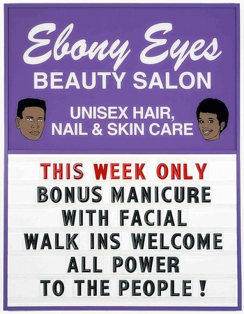 | | Ken Lum, Ebony Eyes, 2000 powder-coated aluminum, enamel, glue, plastic letters 78 x 60 in. (198.1 x 152.4 cm.