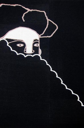 With their simplified, geometric forms and carved features, So's sculptural depictions of the bearded man take on a solemn, museological feel, reminiscent of carefully restored classical artifacts. The cropped face and gilded surface of her ceramic relief also harken back to an earlier period, bringing to mind the gleaming, solemn faces of Byzantine icons. In one of So's knitted pictures, we see a different, more dynamic side to Bellarmine- here, he sits cross-legged on the floor in black pantaloons, a second face emerging from his beard as he plays with a lithe canine companion.
