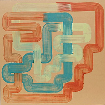 In his latest body of work, complex webs of colour interlace to echo the weave of the canvas itself. The unsettling palette, where pale pinks and blues combine with browns, greens and mustard yellows, underlined with black, unbalances the eye and destroys the continuity of the single line tracing a pattern on the surface. In high contrast to the rough texture of the canvas, each painting is coated with a smooth layer of resin, lending a plasticity and sense of completion to each painting.