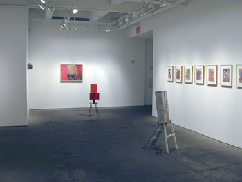 Known predominately for his sculpture and wall drawings, Irazu has recently begun using photography as a support for his paintings and he relates the idea of casting familiar items to photography's ability to reproduce reality. Objects from his studio such as a simple chair, boxes, a stepladder, and a cardboard folder are combined, cast in aluminum and painted with colors drawn from the artist's lexicon of rich reds and ochres. The objects appear as sculptures in the gallery and reappear in the artist's photographs. The photographs are then painted over with rectangular shapes, which emphasize the surface of the photograph while dialoguing with the elements in the image. The cleanedged shapes of paint appear to be pieces of paper or tape collaged to the surface of the prints while simultaneously reading as physical objects in the image such as pieces of actual wood attached to a sculpted chair or a wall in the studio.