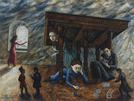 | Kati Heck, Ins Büro! December 23, 2015 – January 23, 2016 Opening: Friday, December 11, 6:00-8:00pm It is with special delight that Corbett vs. Dempsey present Ins Büro!, an exhibition of new paintings, drawings, and sculpture by Kati Heck. This is the first show of the artist with CvsD and her Midwest premiere. Born in Germany, Kati Heck is based in Antwerp, Belgium. With an intense and provocative sensibility that draws on historical precedents from Surrealism to Social Realism, Heck is a painter of astonishing facility, with an alchemical sensitivity to the human form and a devilish ironic streak. Her paintings incorporate strange scenarios, often sustained for a body of work, involving particular characters based on folks she invites into her studio. The resulting images constitute their own, highly unusual and particular world, a fantasy state, some of which is crafted in dreams. Arms are transparent, strange beasts enter the scene including an ostrich serving coffee to a couple on a futon; a young man’s pronounced varicose veins are matched by the other leg, which seems to be frozen; an animated man in a rocking chair holds a ball of light in one hand, the other submerged in a jar of pickles. This new group of works, which includes a mural-sized painting with a full range of haunting and haunted characters, conjures the supernatural in various ways, invoking a spiritual and material ecosystem as singular and peculiar as it is wondrous and open. Kati Heck’s solo exhibitions include M HKA, Antwerp (forthcoming 2016), Tim Van Laere Gallery, Antwerp (2014, 2011), CAD Malaga, Malaga, Spain (2013), Galerie Mario Mauroner, Vienna (2010), tellerschiff der Stadt, Frankfurt (2010), Marc Selwyn Fine Art, Los Angeles (2009, 2006), Mary Boone Gallery, New York (2008), and Museum Het Domein, Sittart, The Netherlands (2008). Ins Büro! is accompanied by a full-color 28-page catalog with an interview of Kati Heck by John Corbett and Jim Dempsey. | ||||