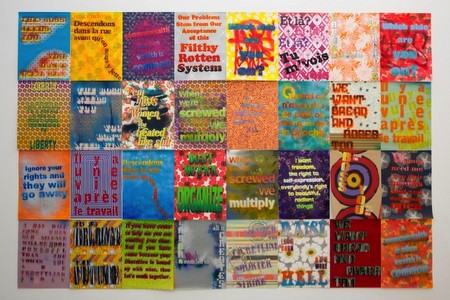 | WHEN ARTISTS SPEAK TRUTH... NOVEMBER 12, 2015 TO MARCH 18, 2016 Opening Reception, Thursday, November 12, from 6:00 to 8:00pm Please join us for the opening of When Artists Speak Truth... an exhibition conceived as a multi-vocal dialogue about how artists contribute to specific political transformation - from Soviet Russia to U.S. presidential elections - and have helped shape an expanded and more nuanced understanding of human rights and social justice over several decades. The exhibition will be on view November 12, 2015 to March 18, 2016 at The 8th Floor located at 17 West 17th Street, New York City with an opening reception on Thursday, November 12 from 6:00 to 8:00pm. Drawing from multiple generations and artistic sensibilities, featured artists include ACT UP, Shimon Attie, Maja Bajevic, Andrea Bowers, Tania Bruguera, Matthew Buckingham, Nancy Burson, Yoan Capote, Mel Chin, Emory Douglas, Sam Durant, Shepard Fairey, Charles Gaines, Rico Gatson, Guerrilla Girls, Edgar Heap of Birds, Sister Corita Kent, Hew Locke, Raul Martínez, Yoko Ono & John Lennon, Adrian Piper, Favianna Rodriguez, Dread Scott, Andres Serrano, Felix Gonzalez Torres, and Jaro Varga. From the art world to the real world, artists in the exhibition express a multitude of messages that collectively illustrate what happens when culture is used as will to power. Ranging from political posters, interactive installations, painting, drawing, and pedagogical display, to photography and sculpture, the selected works both enact and question the role artists play in communicating the issues affecting our broader culture. When Artists Speak Truth... explores the ways in which artists engage in political messaging, borrowing methods from mass communication such as poster campaigns, graffiti, political portraiture and satire, public interventions, and varied forms of amplification, which demonstrate art's ability to transmit and facilitate protest and critique. These forms of objection and commentary are uniquely possible in the context of art and the work of many artists in the exhibition has a continuing presence and widespread impact on public life. The selected artists touch on a variety of contemporary and historical socio-‐political issues, ranging from corporate power to religion and violence. In Mel Chin’s Cross for the Unforgiven ( 2 00 2 ), a Maltese cross—a symbol of the Crusades—is constructed from eight AK-‐47s, a weapon that signifies international resistance to the West. From 1967 until the 1980s, Emory Douglas was the Minister of Culture for the Black Panther Party and his graphic artwork was featured prominently in issues of The Black Panther newspaper. Included in the exhibition is his illustration for the September 21, 1974 issue, which depicts the hand of corporate power—comprised of Pan Am, Gulf, PepsiCo, Chevron, IBM, Ford, The Chase Manhattan Bank, among others—pulling the strings of then-‐president Gerald Ford, "the 38th Puppet of the United States." Sam Durant's Emory Douglas Suite (You pig) is part of a larger series completed in 2004 in which Durant adapts Douglas' depictions of police aggression. Drawing on the surreal collage and graphic design sensibility of Emory Douglas, Favianna Rod rigu ez's political posters highlight causes such as immigrants' rights, abortion rights, and voters' rights with slogans like "I'm a slut. I vote. So does everyone I sleep with...Keep ur government off my pussy." Many of Rodriguez's recent posters have centered on the poetic symbol of the butterfly, which in her work is a reminder that living beings have the right to move freely, embodying the determination of immigrants who come to America in search of their dreams. Working with text and archives respectively, Maja Bajevic and Jaro Varga will create immersive site-‐specific installations in the gallery. Varga's Library series (begun in 2008) is a room-‐sized print of a library in which the book spines have been left intentionally blank. The viewer is invited to write in titles of personal import, literally penning the names of books onto the spines, generating a collective and participatory notion of what constitutes essential knowledge. Bajevic's To be continued was first staged in 2014 at the National Museum in Oslo. For her performance in conjunction with the exhibition, Bajevic will fog the southern windows of the gallery, handwriting political inscriptions into the frosted windows and extending the exhibition’s visibility to the outside world. Andrea Bowers ' Workers' Rights Posters (2013) and Edgar Heap of Birds' ongoing mono-‐print series Dead Indian Stories face off with past and present stories of the loss of laborers' rights and Native American communities across the United States. Matthew Buckingham also addresses the politics of Native land ownership, as he looks to the history and projected future of Mount Rushmore with his 2002 project The Six Grandfathers, Paha Sapa, in the Year 502,002 C. E. He questions the current perception and geologic future of the monument, which hosts portraits of the four founding fathers, carved into land stolen from Sioux Indians by an active member of the Ku Klux Klan. Artworks in the exhibition also generate new forms of commemoration for political leaders and movements. Rico Gatson, Dread Scott, and Andres Serrano create alternative forms of political portraits. Serrano’s Portrait of Fidel from his Cuba series features a photograph of Fidel Castro o n the wall of a modest bedroom of an unidentified Cuban. Gatson's graphic portraits of Nina Simone, Gil Scott-‐Heron, James Baldwin, and Amiri Baraka (2014-‐2015) are expressions of the power that emanates from radical artists and thinkers. Paintings from Dread Scott's Revolutionary Archive (2010-‐2012) draw on vintage photographs from the arc of Communist uprisings, including the Paris Commune, the Russian Revolution and the Chinese Cultural Revolution. Each of the works from the series exhi